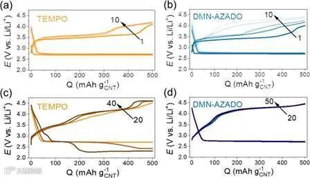 在1.0 M LiTFSI / TEGDME中具有0.02 M(a,c)TEMPO和(b,d)DMN-AZADO的Li–O2电池的恒电流循环曲线。(a,b)最初的10个周期(1、2、3、5和10个周期)和(c,d)连续的20、30、40和50个周期。电流密度为100 mAh g-1CNT,容量限制为500 mAh g-1CNT。