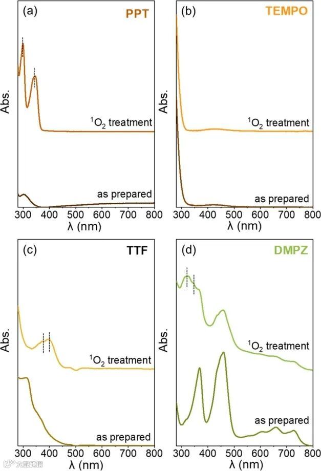 (a)PPT,(b)TEMPO,(c)TTF和(d)DMPZ 的制备好的(底部)和1O2处理的ORM的UV-vis光谱。1O2从H2O2和NaClO的去离子水混合物中产生。垂直虚线表示1O2处理后新出现的信号。
