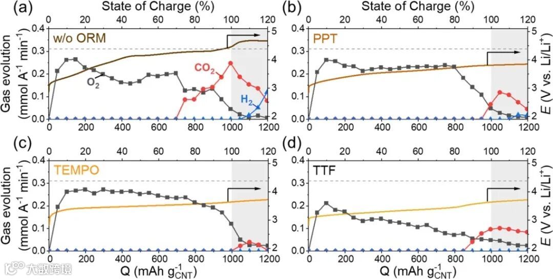 Li-O2电池(a)无ORM或在1.0 M LiTFSI / TEGDME中包含0.2 M(b)PPT,(c)TEMPO,(d)TTF。在进行充电测试和OEMS分析之前,将电池以1000 mAh g–1 CNT放电,电流密度为100 mA g–1 CNT。浅灰色框表示过度充电区域(> 1000 mAh g –1 CNT)。水平虚线表示理想2E- / O2个气体释放速率。