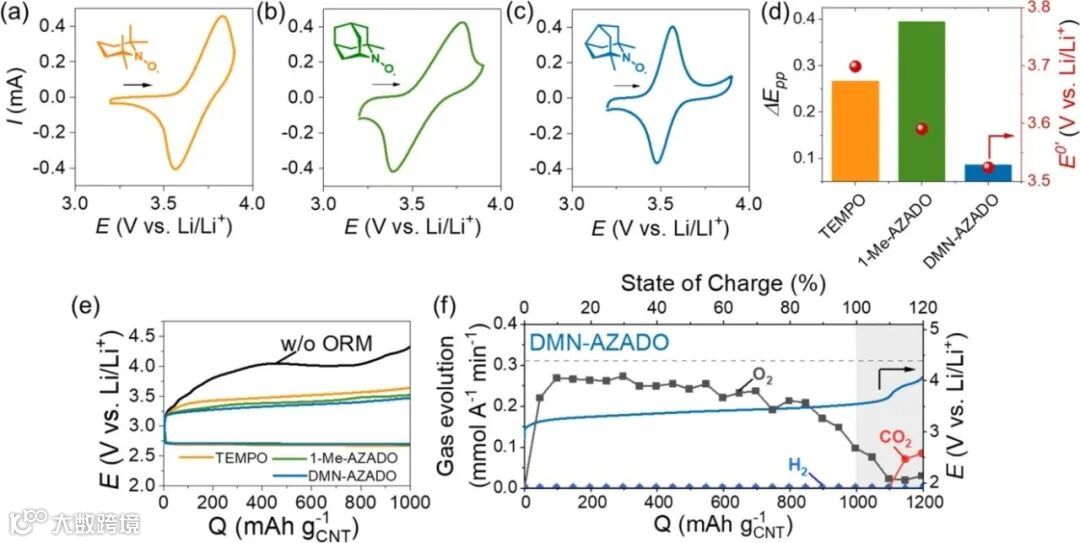 (a–c)(a)TEMPO,(b)1-Me-AZADO和(c)DMN-AZADO在Ar气氛下以1.0 mV s-1的扫描速率的循环伏安图(CV)。(d)峰-峰电位(ΔEpp)和正常电位(E°')的比较。(e)在100 mA g-1CNT下,含有0.2 M ORM(或不含ORM)和1.0 M LiTFSI / TEGDME的恒电流Li–O2电池的电压曲线。(f)使用0.2 M DMN-AZADO在第一次装料过程中进行定量气体分析。在OEMS分析之前,电池以1000 mAh g-1CNT放电。浅灰色区域表示过度充电区域(> 1000 mAh g-1CNT)。水平虚线表示理想的2e–/O2气体逸出速率。