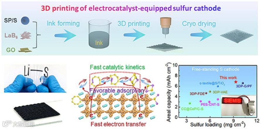 使用包含硫/碳和LaB6电催化剂的混合墨汁,通过3D打印构造自支撑硫正极。 -