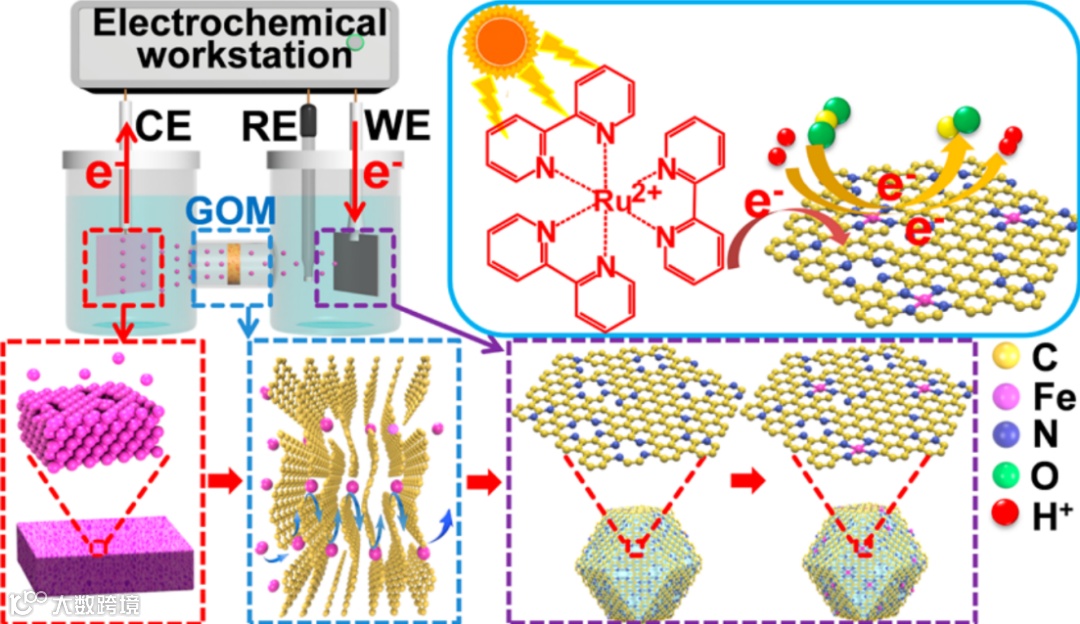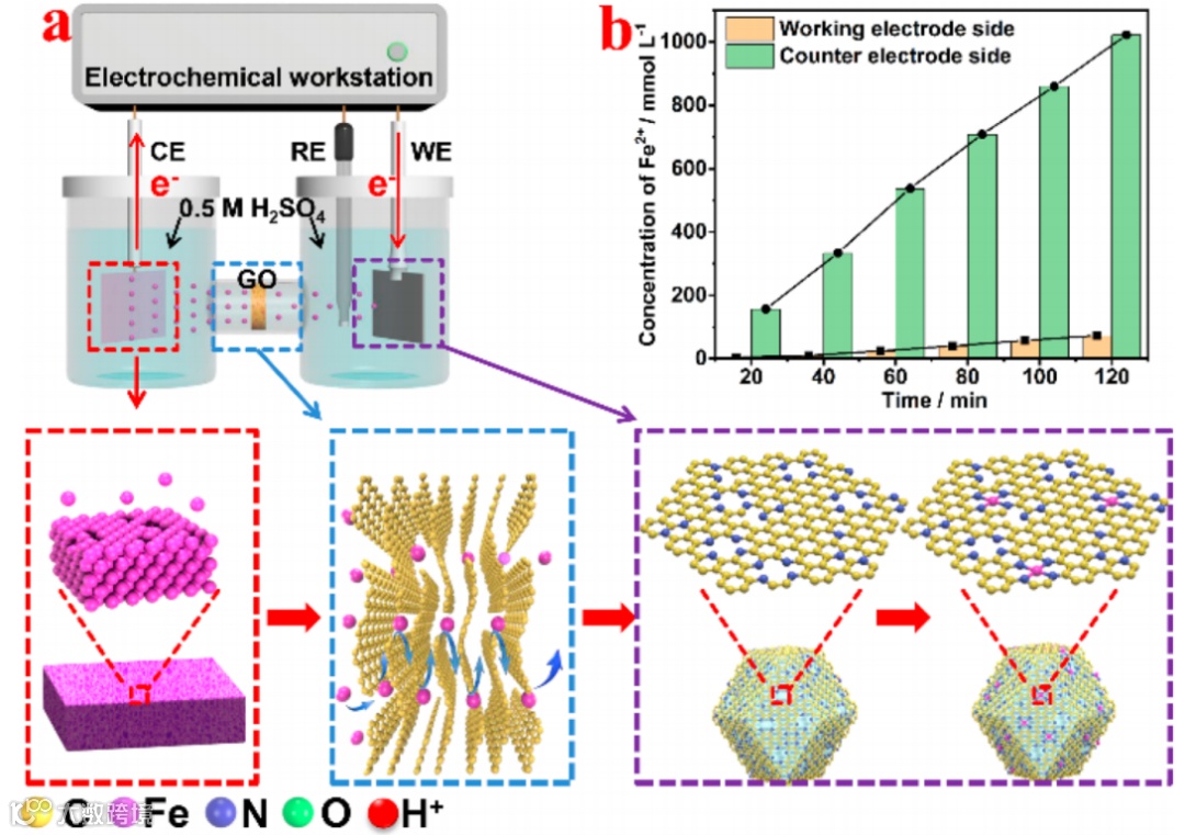 由于GOM膜具有多层堆叠的结构,内部的层间距很窄且表面的缝隙较少,阻止了大量Fe2+的通过,仅有少量的Fe2+穿过GOM并到达N-C侧,从而大大降低了Fe2+从CE向WE的传输速率。Fe2+被N-C中的大量缺陷捕获并接受来自WE的电子,形成Fe-SAs/N-C催化剂。由于WE周围Fe2+的浓度很低,有效的阻止了Fe原子的聚集和原子核的生长。
