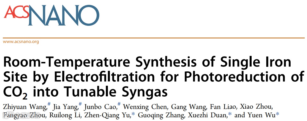 在温和的合成条件下,开发一种方便有效的制备单原子催化剂的方法仍然是一项具有挑战性的任务。基于以上现状,中科大吴宇恩教授,深圳大学余振强研究员,华东理工大学段学志等在国际知名期刊ACS NANO上发表题为“Room-Temperature Synthesis of Single Iron Site by Electrofiltration for Photoreduction of CO2 into Tunable Syngas”的论文。王志远,杨佳,曹峻博为本文共同第一作者。