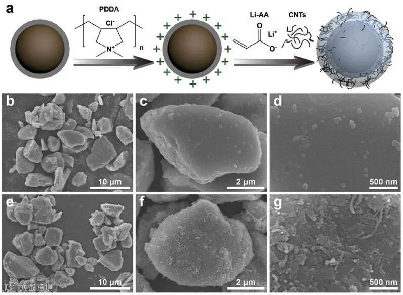 (a) Schematic illustration for the preparation of C-SiOx/C. SEM images of (b–d) SiOx/C and (e–g) C-SiOx/C.