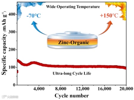 得益于电解液低冰点和高沸点,再加上该电池体系所用的电极材料在低温和高温条件下均具有良好的稳定性,这种全电池甚至可以在220℃(从-70℃到150℃)的宽温度范围内工作,这几乎是当前电池(从-40℃到60℃)的两倍。另一方面,本体系中较低的工作电压仍然限制了锌有机电池的能量密度,因此在今后的研究中仍有必要探索具有高氧化还原电位的有机物。