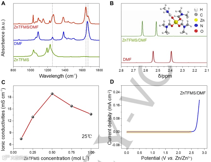 (a) ATR-FTIR spectra of pristine DMF, ZnTFMS, and ZnTFMS/DMF electrolyte.
