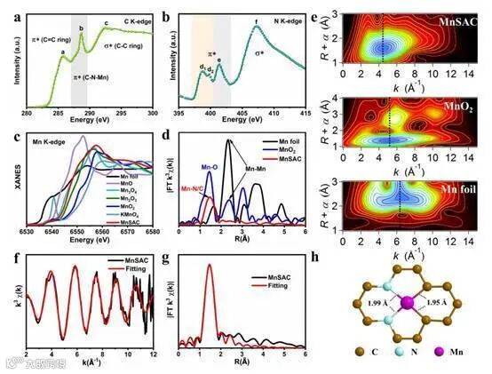 (a)MnSAC的C K边XANES和(b)N K边XANES光谱。(c)Mn K边XANES和(d)MnSAC的FT EXAFS光谱和参考值。(e)MnSAC、MnO2和Mn箔的WT-EXAFS图。(f)k空间和(g)R空间的FT-EXAFS拟合曲线。(h)MnSAC的原子结构模型。