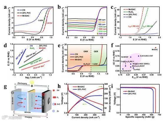 (a)MnSAC,CN和20%Pt/C经iR校正的ORR极化曲线。(b)MnSAC不同转速下的ORR-LSV曲线。(c) MnSAC、CN、市售RuO2和20%Pt/C在0.1 M KOH溶液中的iR校正OER极化曲线和(d)相应的Tafel曲线。(e)整体极化曲线。(f)MnSAC的ΔE和E1/2值与一些双功能催化剂的比较。(g) 锌空气装置示意图。(h) MnSAC和Pt/C锌空气电池的极化和功率密度曲线(i)5 mA cm-2下MnSAC和Pt/C锌空气电池的比容量。