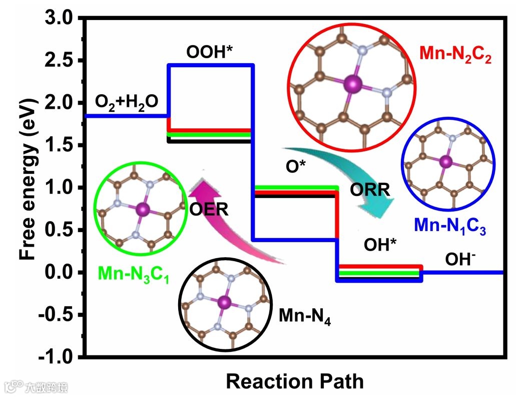 Mn-N2C2、Mn-N4、Mn-N3C和Mn-N1C3上ORR和OER的自由能图,其中Mn为紫色,N为白色,C为棕色。
