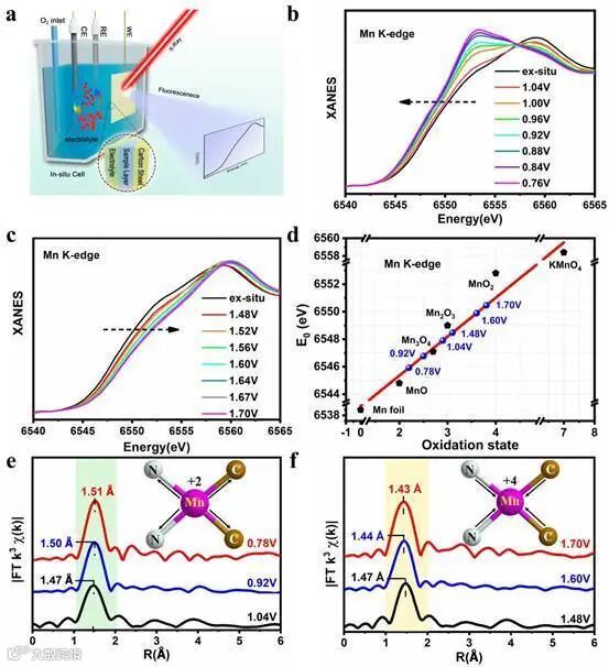 当施加一系列ORR电位时,Mn K边的吸收边移向低能(图4b),表明Mn物种的平均氧化态降低。而施加一系列OER电位则会导致XANES边缘发生高能移(图4c,显示了Mn氧化态的升高。