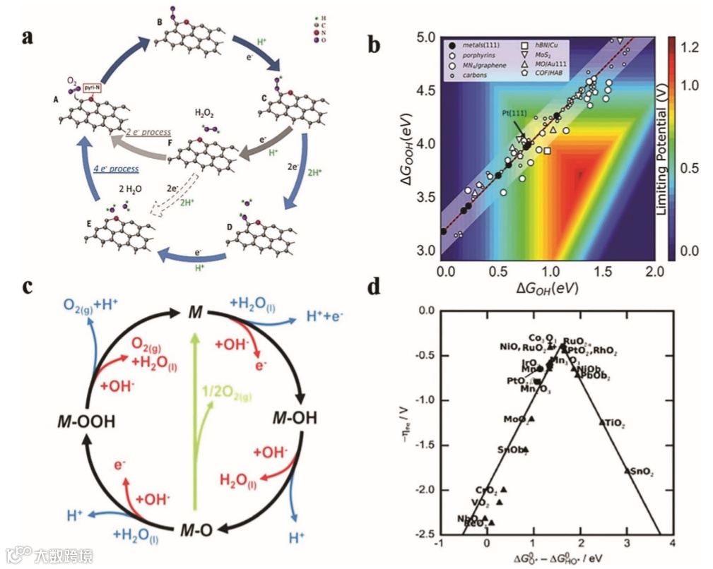 d) Volcano plots of ORR and OER overpotential with respect to adsorption energy of OH *. Reproduced with permission.