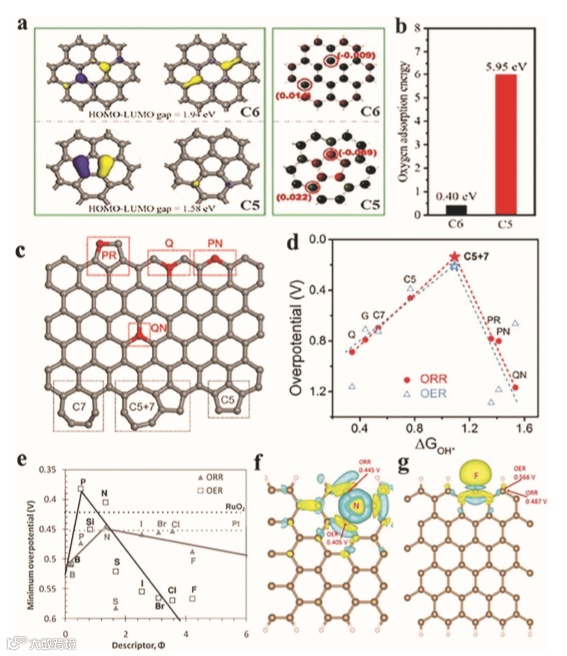 e) Minimum overpotential of ORR/OER versus the descriptor Φ for graphene doped with different elements. Differential charge density distributions of