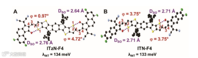 B) ITN-F4. Carbon is shown in black, nitrogen in blue, sulfur in yellow, and fluorine in green. Alkyl chains are deleted for clarity. End group–core torsions (ϕ) are calculated from the planes encompassed by atoms 1–4 and are shown in red, and S⋯O distances (DSO) are depicted in purple.