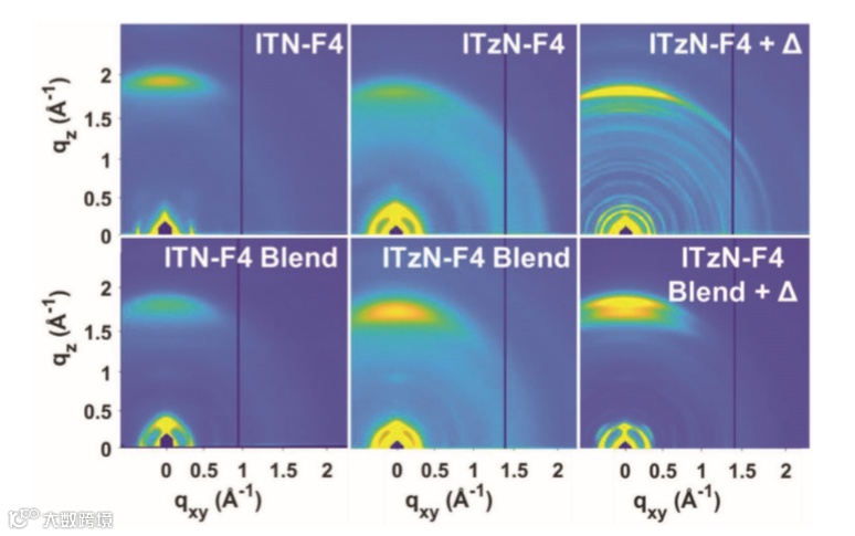 fsTA揭示了ITN-F4和itcn-F4在有施主聚合物PBDB-TF的薄膜中都经历了超快空穴转移(<300fs),尽管在纯膜和共混膜中都形成了准分子态。稳态下发光电池的阻抗谱显示,ITN-F4混合物的复合寿命比ITzN-F4混合物的复合寿命长。最后,本文的研究结果表明,氟化和π-延伸可以同时促进表面填充,降低内部重组能,增加面间π-π电子耦合,提高光伏效率。