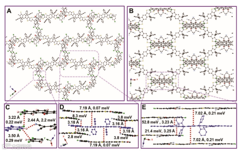 E) distances and electronic couplings in the ITN-F4 crystal structure. In all panels, carbon is shown in black, fluorine in green, nitrogen in blue, oxygen in red, sulfur in yellow, hydrogen in pink, and alkyl chains have been omitted for clarity. In panels (C–E), alkyl phenyl substituents are deleted from all views except for the blue colored molecules, and transfer integrals are shown between the blue molecules and those identified by red dashed lines