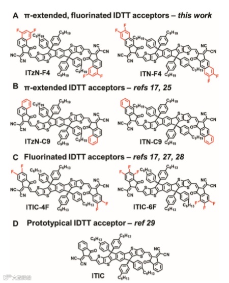 在这里,作者们使用实验和计算相结合的方法来创建和表征新的含有NFA的吲哚噻吩(IDTT),该NFA既具有π延伸又具有氟化。之所以科研人员选择这些系统,是因为它们与高性能NFA的合理设计相关,因为IDTT核心是NFA支架中使用最广泛、性能最高的一种,其中ITIC是最著名的例子。此外,π延伸和氟化也是调整其他类型有机半导体性能的成熟方法。