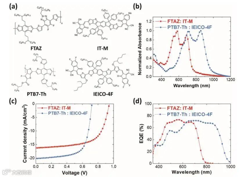 b) Optical absorption of FTAZ:IT-M and PTB7-Th:IEICO-4F thin films.