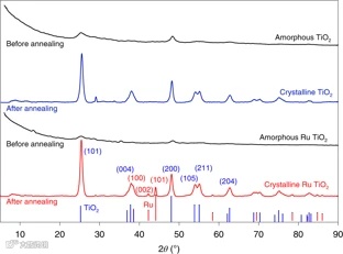 XRD patterns of TiO2 and Ru@TiO2 before and after annealing.