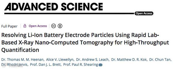 为此,伦敦大学学院Prof. Paul R. Shearing课题组近日在国际知名期刊Advanced Materials上发表了题为“Resolving Li‐Ion Battery Electrode Particles Using Rapid Lab‐Based X‐Ray Nano‐Computed Tomography for High‐Throughput Quantification”的研究文章, Dr. Thomas M. M. Heenan是本文的第一作者。