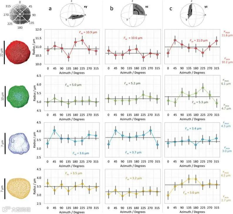 Analyzing single NMC811 particles characterized using 5‐min X‐ray computed tomography (CT). Radii measurements including error bars for the four particles (red, green, blue, and yellow) at eight azimuthal positions for a) the x−y, b) the x−z, and c) the y−z orthogonal planes. All quantifications reported are from the 5‐min X‐ray CT data. Raw values can be found in Table S1 and S2, Supporting Information.