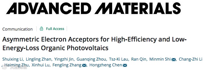 为了同时解决这两个问题,陈红征教授和施敏敏教授等人在国际知名期刊Advanced Materials上发表了题为“Asymmetric Electron Acceptors for High‐Efficiency and Low‐Energy‐Loss Organic Photovoltaics”的论文, 李水兴博士后是本文的第一作者。
