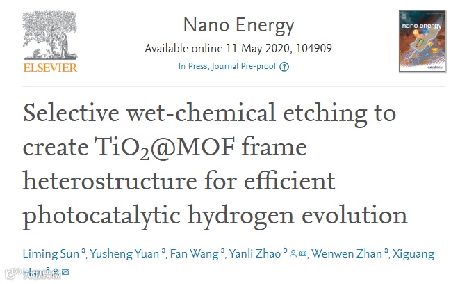 近日,江苏师范大学韩锡光教授和新加坡南洋理工大学赵彦利教授等在国际知名期刊Nano Energy 上发表题为“Selective wet-chemical etching to create TiO2@MOF frame heterostructure for efficient photocatalytic hydrogen evolution”的论文。江苏师范大学孙立鸣副教授为本文第一作者。