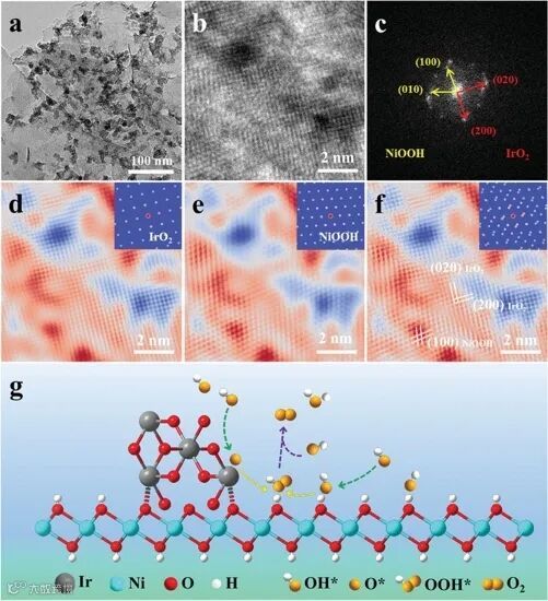 g) Illustration of the proposed OER mechanism. First, OH* and O* are adsorbed on Ni(OH)2 and IrOx, respectively (green arrows). Then, the two intermediates are combined at the interface, accelerating the formation of OOH* (yellow arrows). Finally, O2 is generated via desorption of OOH* (purple arrows).