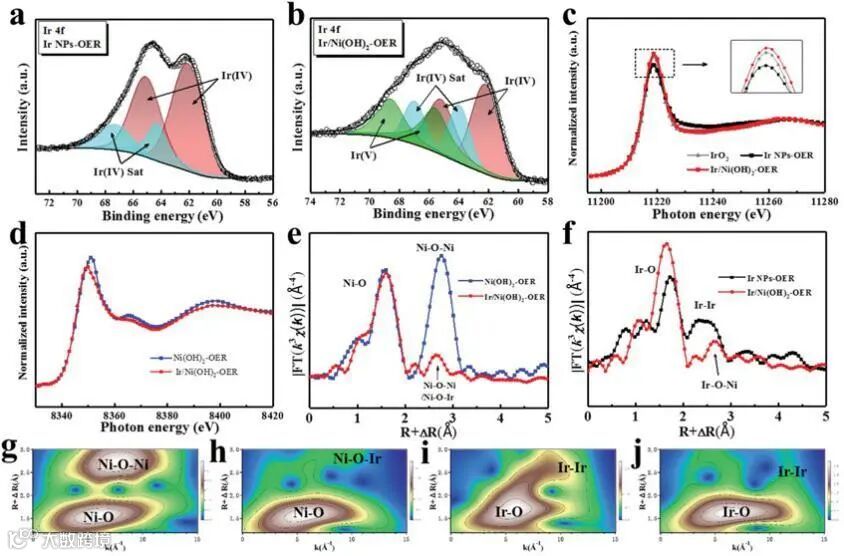 e) Ni K‐edge EXAFS spectra of Ni(OH)2‐OER and Ir/Ni(OH)2‐OER.