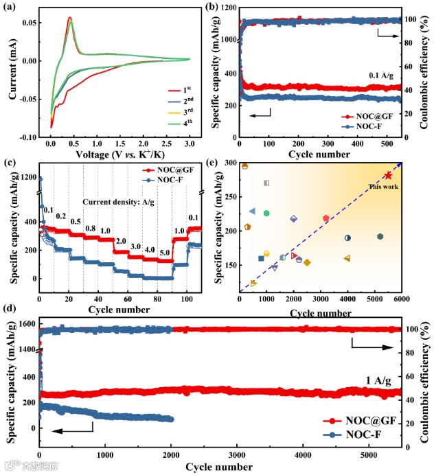 The Electrochemical Properties of NOC@GF and NOC–F. (a) CV curves at a scan rate of 0.2 mV/s, (b) cycling at 0.1 A/g, (c) rate performance from 0.1 to 5 A/g, (d) long-term cycling stability and Coulombic efficiency at 1 A/g, and (e) comparison of cycling performance at 1 A/g among these carbonaceous anodes for KIBs.