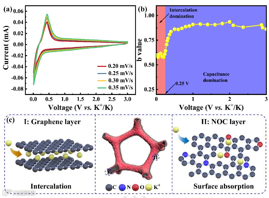 (a) CV curves at various scan rates, (b) b values plotted against the voltage for cathodic scans (K+ intercalation), (c) the schematic illustration of K+ storage mechanism of NOC@GF.