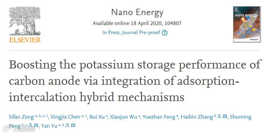近日,中国科技大学余彦教授,Haibin Zang和Shuming Peng等人在国际知名期刊Nano Energy (2018 IF: 15.548)上发表题为“Boosting the potassium storage performance of carbon anode via integration of adsorption-intercalation hybrid mechanisms”的综述。Sifan Zeng,XingjiaChen为本文共同第一作者。