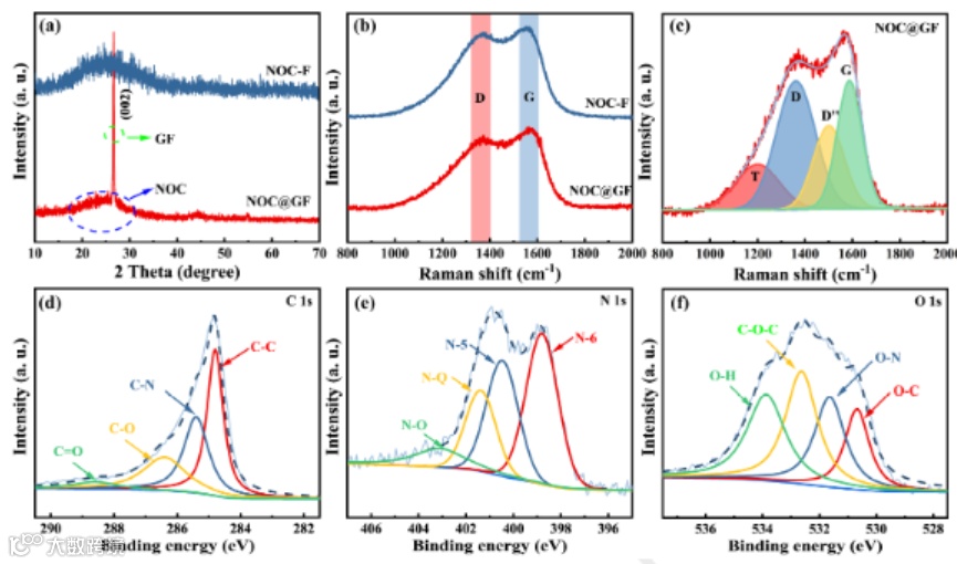 The structural characterization of NOC@GF. (a) XRD patterns, (b) Raman spectra, (c) the fitted Raman spectrum, (d–f) the fitted XPS spectra of C 1s, N 1s, and O 1s.