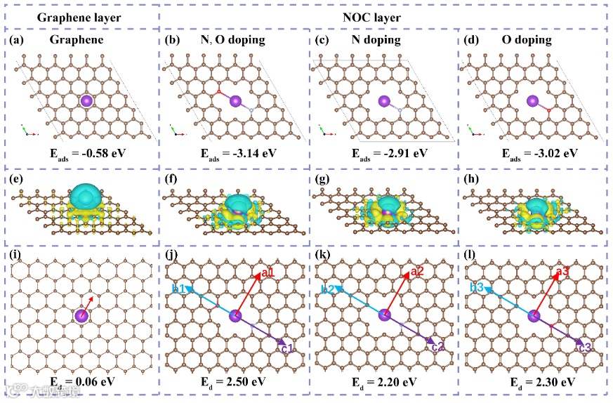 Theoretical simulations of K atom adsorption and diffusion. Top view of K atom adsorbed on (a) graphene, (b) N, O doping, (c) N doping, (d) O doping structures and the corresponding adsorption energies. (e–h) the corresponding side view of electron density differences of K atom adsorbed on these structures, the yellow and blue areas stand for increased and decreased electron density, respectively. (i–j) Top view of K atom diffusion on these structures and the corresponding diffusion energies. The brown, silver, red and purple balls represent C, N, O and K atoms, respectively.