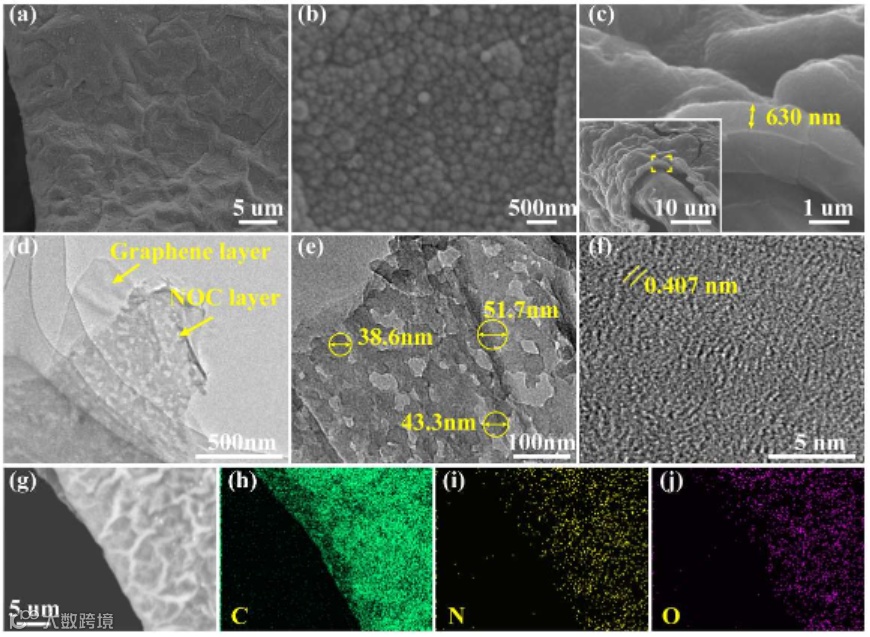 The morphology of NOC@GF. (a, b) The top-view SEM images, (c) the cross-view SEM images, (d, e) the TEM images, (f) HRTEM image, (g) the SEM image, (h–j) the elemental mapping images of C, N, and O.
