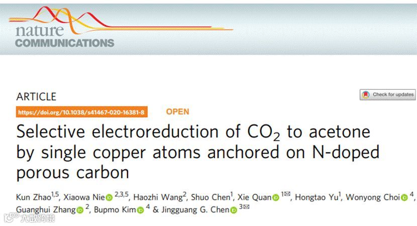 近日,大连理工大学的全燮教授、哥伦比亚大学的陈经广教授等人利用Cu单原子催化剂将CO2还原为C2+产物在国际知名期刊Nature Communication上发表题为“Selective electroreduction of CO2 to acetone by single copper atoms anchored on N-doped porous carbon”的文章。文章第一作者是Kun Zhao。