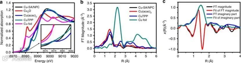 a. Normalized XANES spectra at Cu K-edge of Cu-SA/NPC, Cu2O, cupric acetylacetonate (Cu(acac)2), copper meso-tetraphenylporphine (CuTPP), and Cu foil.