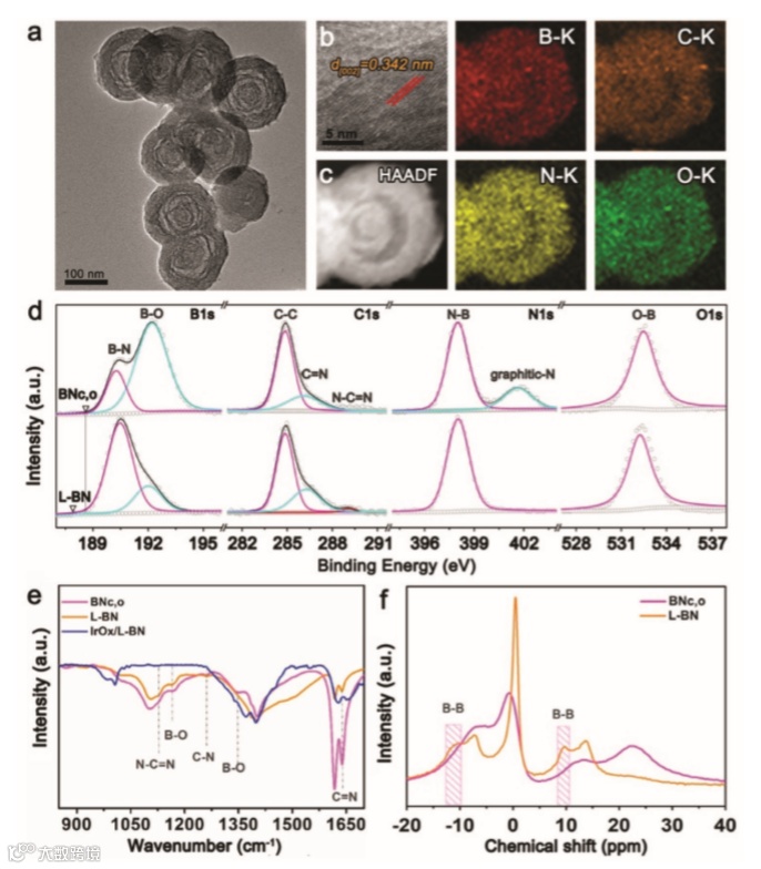 本文报道了一种特殊的催化剂载体,掺入C,O的激光改性氮化硼(L-BN),用于析氧反应。L-BN在电催化方面具有独特的优势,即在氧化条件下具有较高的耐腐蚀性,层间B-B偶极相互作用产生的导电性增强,以及N-C=N键与IrOx催化剂的强相互作用。作为一种优良的底物,L-BN比碳黑具有更高的活性和稳定性。