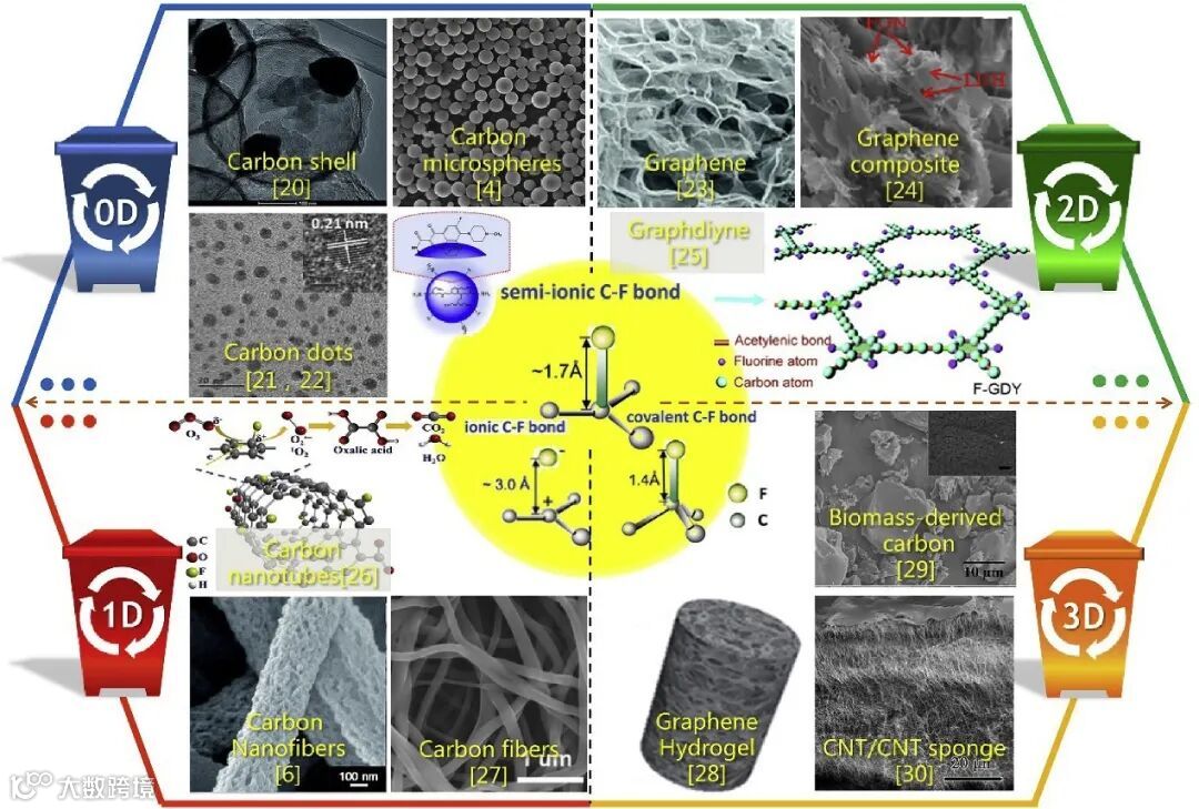 重点介绍了近年来用于SCs的掺氟/氟化碳基材料的研究进展。如图1所示,根据维度将掺氟/氟化碳材料分为四个部分,维度是性能的关键参数之一。为了说明氟原子的引入对电化学性能的影响,还对氟原子的电化学性能进行了讨论。最后,提出了未来可能的研究和商业发展趋势,以优化其性能。