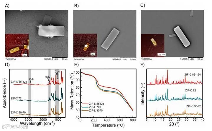 (A) ZIF-C 30−70, (B) ZIF-C 72, and (C) ZIF-C 85−124 nanosheets and (D) FTIR spectra, (E) TGA curves, and (F) XRD results of ZIF-C nanosheets prepared in PVA solutions.