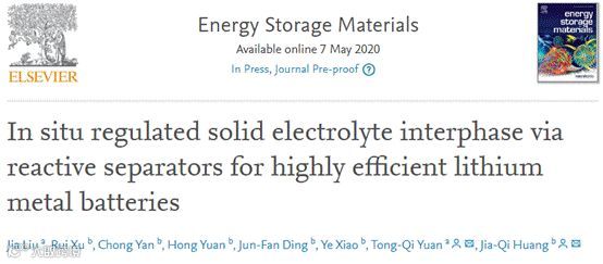 近日,北京林业大学的袁同琦教授、北理工黄佳琦等人在在国际知名期刊Energy Storage Materials上发表题为“In situ regulated solid electrolyte interphase via reactive separators for highly efficient lithium metal batteries”的文章。Jia Liu为本文第一作者。