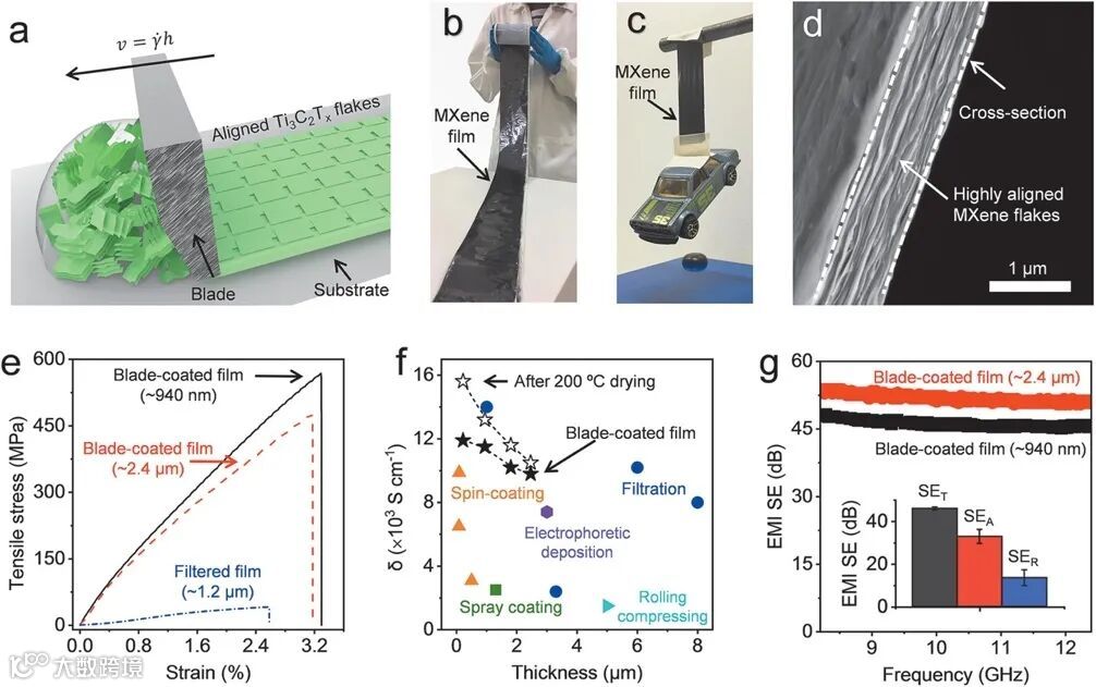 在200°C下真空干燥6小时后,使用刮涂法生产的薄膜的电导率值达到≈15100 S cm-1,这是迄今为止MXene薄膜的最高公开值。在实际应用中,对于X波段(8.2-12.4 GHz)的940 nm厚膜,高电导率可提供47.9 dB的出色EMI屏蔽性能。