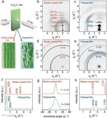 d,e) SAXS/WAXS patterns of blade‐coated films (d) and filtered films (e) prepared using large MXene flakes when the film plane is perpendicular to the X‐ray beam.