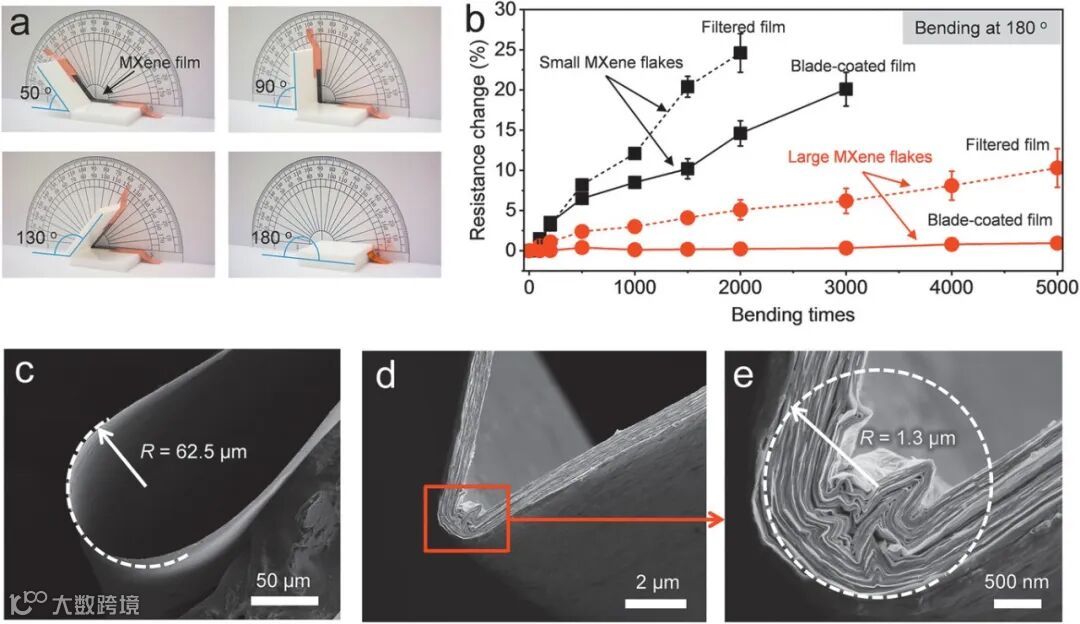 b) Changes in resistance of MXene film after fully folded (180°) for up to 5000 cycles. Filtered and blade‐coated films that are made from small flakes are broken after bending for ≈2000 and ≈3000 cycles, respectively.