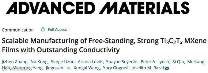 为了应对这些挑战,近日, 澳大利亚迪肯大学Joselito M. Razal 和德雷塞尔大学 Yury Gogotsi 等人在Advanced Materials 上发表题为“Scalable Manufacturing of Free-Standing, Strong Ti3C2Tx MXene Films with Outstanding Conductivity”的文章。Jizhen Zhang为本文的第一作者。