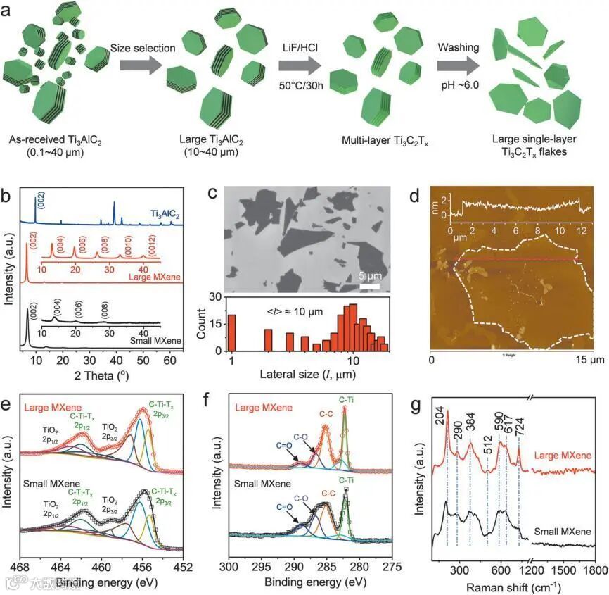 在纯MXene薄膜的情况下,较低的电导率和拉伸强度值部分是由于多种因素的结合,包括较小的MXene鳞片尺寸(几百纳米的横向尺寸)、由于超声处理而导致的MXene鳞片上的缺陷、由于片状不完美和不规则的点胶而产生的胶卷。在溶液加工过程中,控制MXene薄片的尺寸,方向和堆积密度对于改善纯MXene薄膜的整体性能至关重要。然而,目前没有研究调查薄片尺寸和MXene薄片的取向对其宏观结构性质的影响。