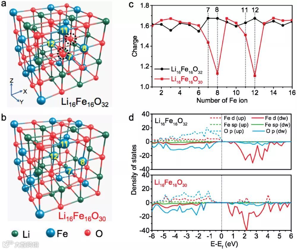 a,b) The structure modes of Li16Fe16O32 (a) and Li16Fe16O30 (b).
