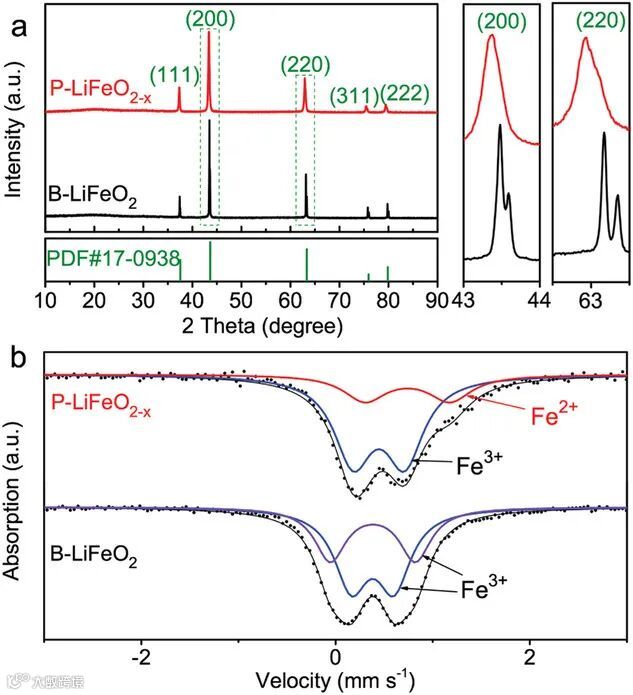 b) Mössbauer spectra of P‐LiFeO2−x and B‐ LiFeO2.