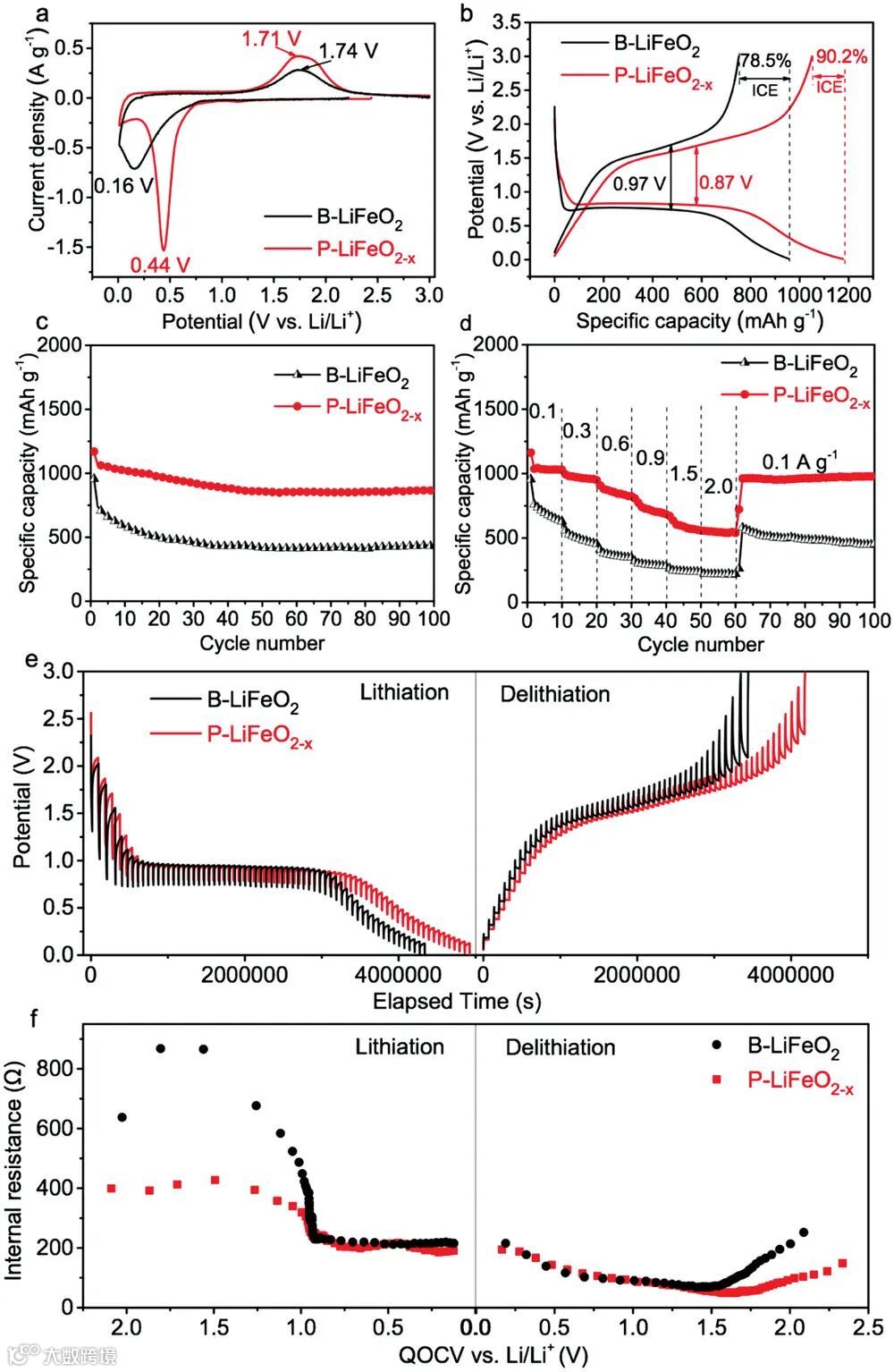 f) internal resistance of P‐LiFeO2−x and B‐ LiFeO2.