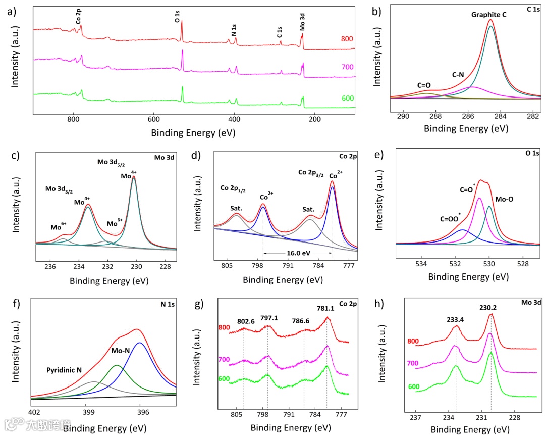 g)-h) XPS spectra of Co and Mo from the Co2Mo3O8@NC samples (red line: 800, pink line: 700, green line: 600).