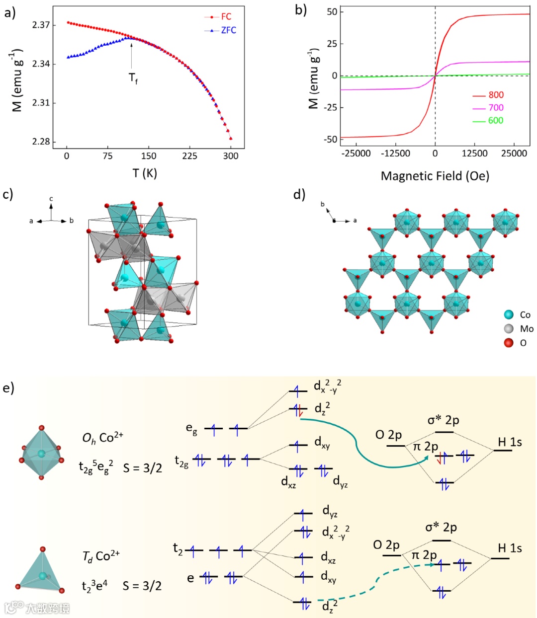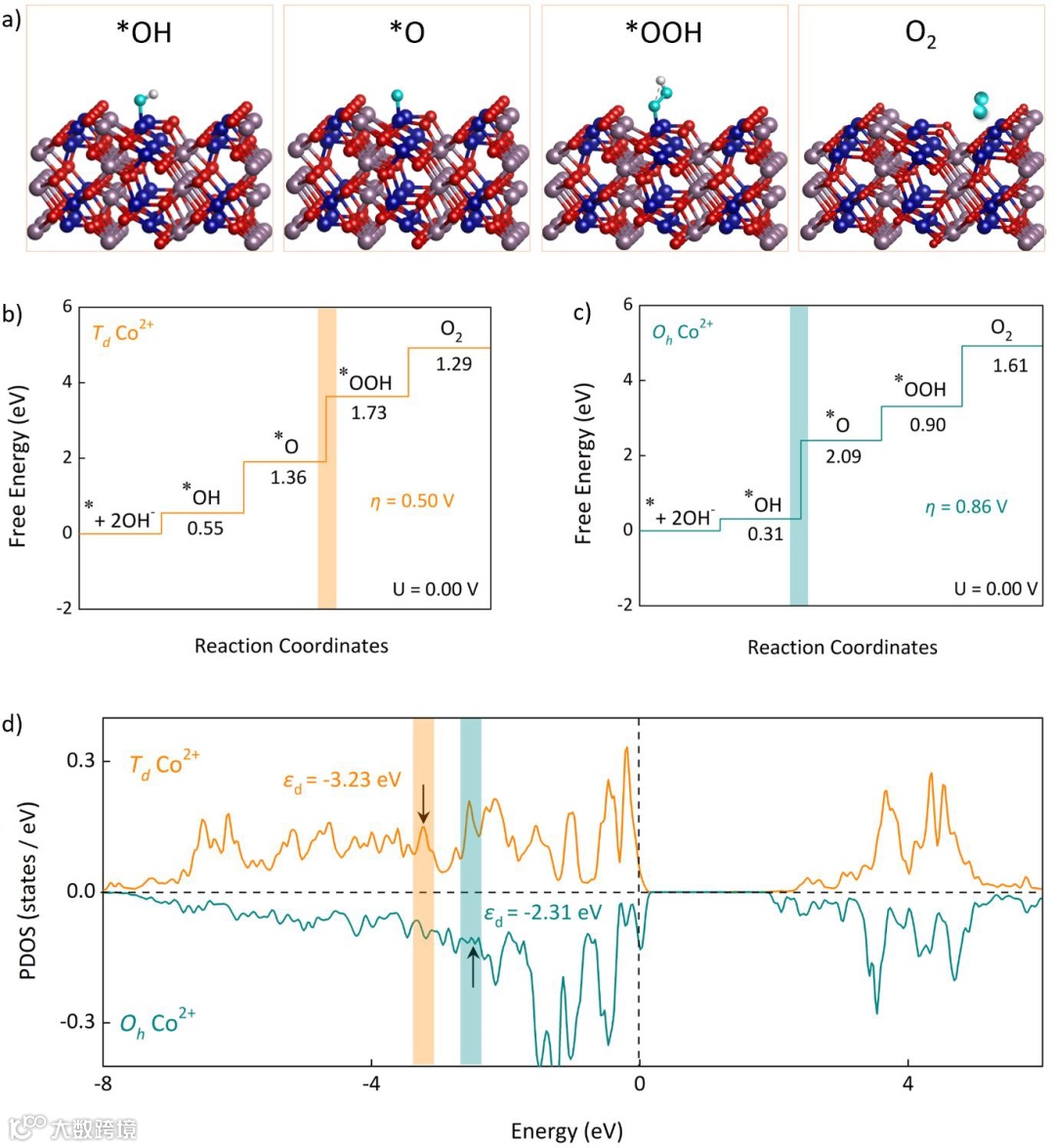 e) Schematic representation of the favored OH uptake with the 3d orbitals for in Td and Oh sites of Co2+, respectively.